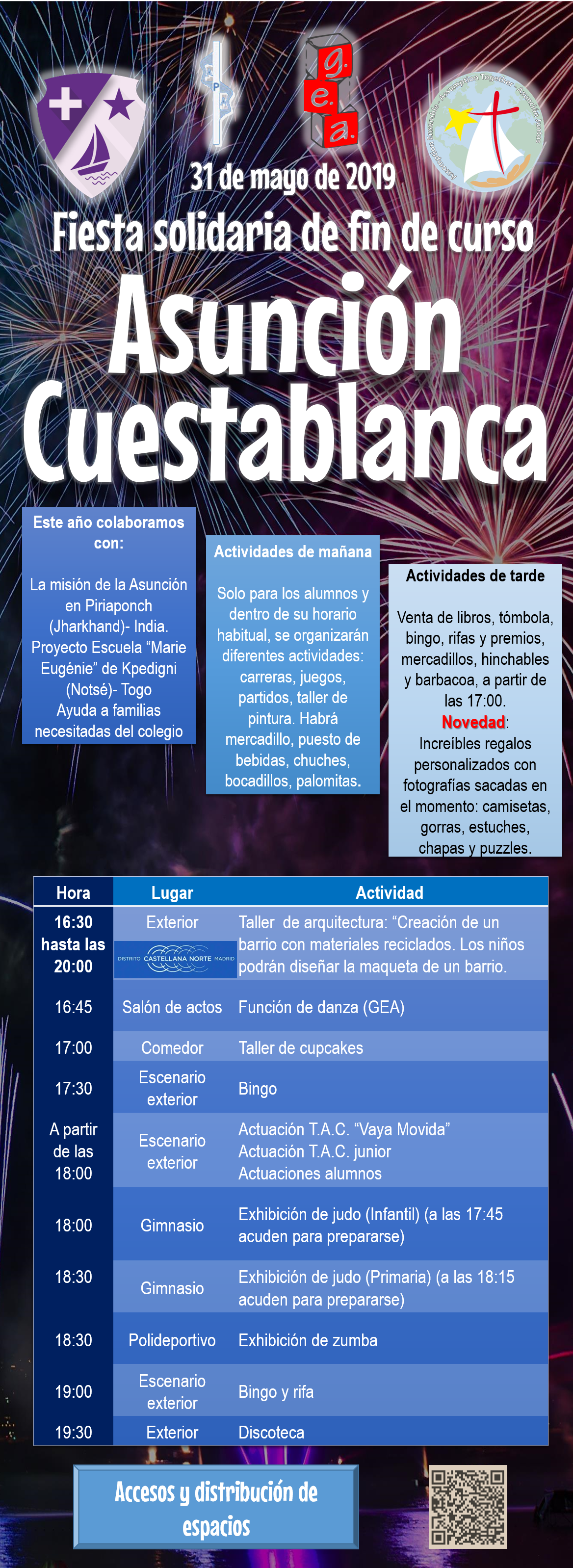 En el calendario de la Comunidad Educativa el 31 de mayo de 2019 está marcado en rojo porque es nuestra fiesta. Nuestra fiesta solidaria y de fin de curso. Aquí iremos compartiendo imágenes del día. De momento compartimos la organización del día. Buen día a todos.