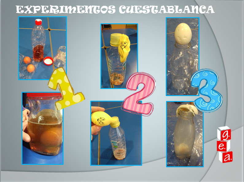 También hemos metido un huevo duro en una botella de boca estrecha...¡La botella ha succionado el globo cuando hemos calentado su boca!.
