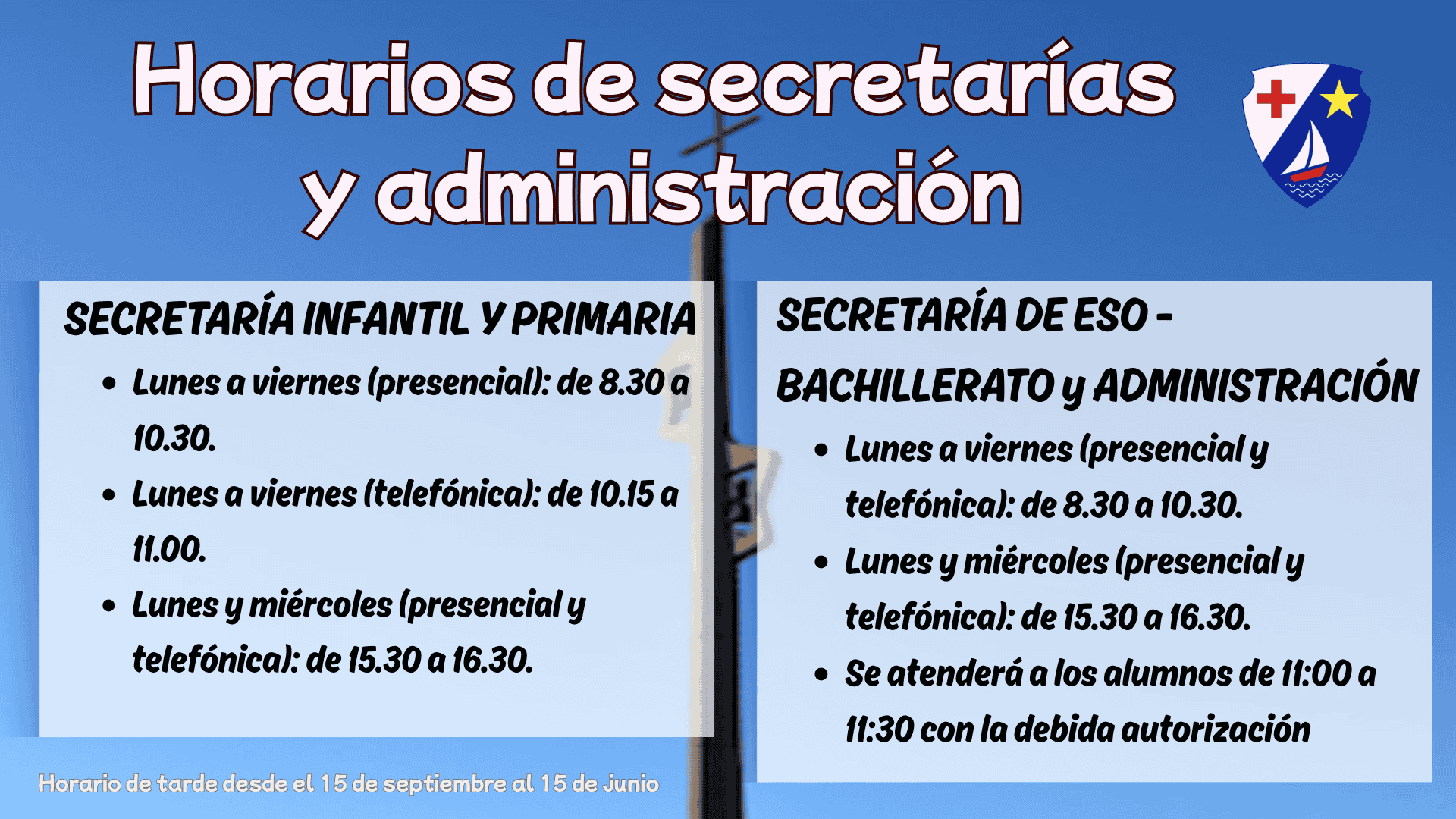 🌆 Lunes y miércoles (presencial y telefónica): 15:30 – 16:30 (tardes del 15 de septiembre al 15 de junio)